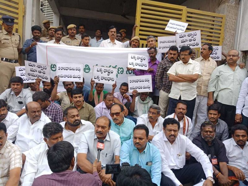 పోలీసులు రంగంలోకి దిగి నిరసన కారులని, రైతులని అరెస్ట్ చేశారు. ఒక్క ఒక్క రాష్ట్రం ఒక్క రాజధాని, మూడు రాజధానులు వద్దు అమరావతి ముద్దు అంటూ రైతులు ప్లకార్డులతో నిరసన చేపట్టారు.