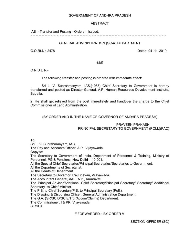 ఈ ఆదేశాల మేరకు ఎల్వీ సుబ్రమణ్యం ఏపీ ప్రభుత్వ సీఎస్గా నియమితులయ్యారు. ఏపీలో వైసీపీ ప్రభుత్వం అధికారంలోకి వచ్చిన తర్వాత కూడ ఎల్వీసుబ్రమణ్యాన్ని కొనసాగిస్తూ జగన్ సర్కార్ నిర్ణయం తీసుకొంది.