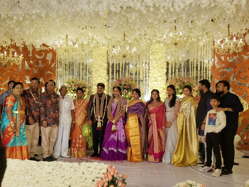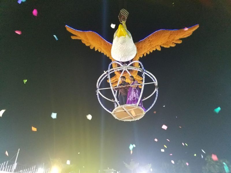 అనుకొన్నట్టుగానే నారాయణరావు తన కొడుకు కోడలు కోసం పుష్పక విమానం లాంటి ప్రత్యేక రథాన్ని తయారు చేయించారు. పెళ్లి రిసెప్షన్ వేదిక వద్దకు కొడుకు, కోడలును సందీప్ ఆయన భార్య సావర్యలను పుష్పక విమానం లాంటి రథంలో గ్రాండ్గా తీసుకొచ్చారు క్రేన్ సహాయంతో 100 అడుగుల ఎత్తులో కొత్త వధూవరులను ఉంచి లేజర్ లైట్ల వెలుగులో రిసెప్షన్ వేదిక వద్దకు తీసుకొచ్చారు.
