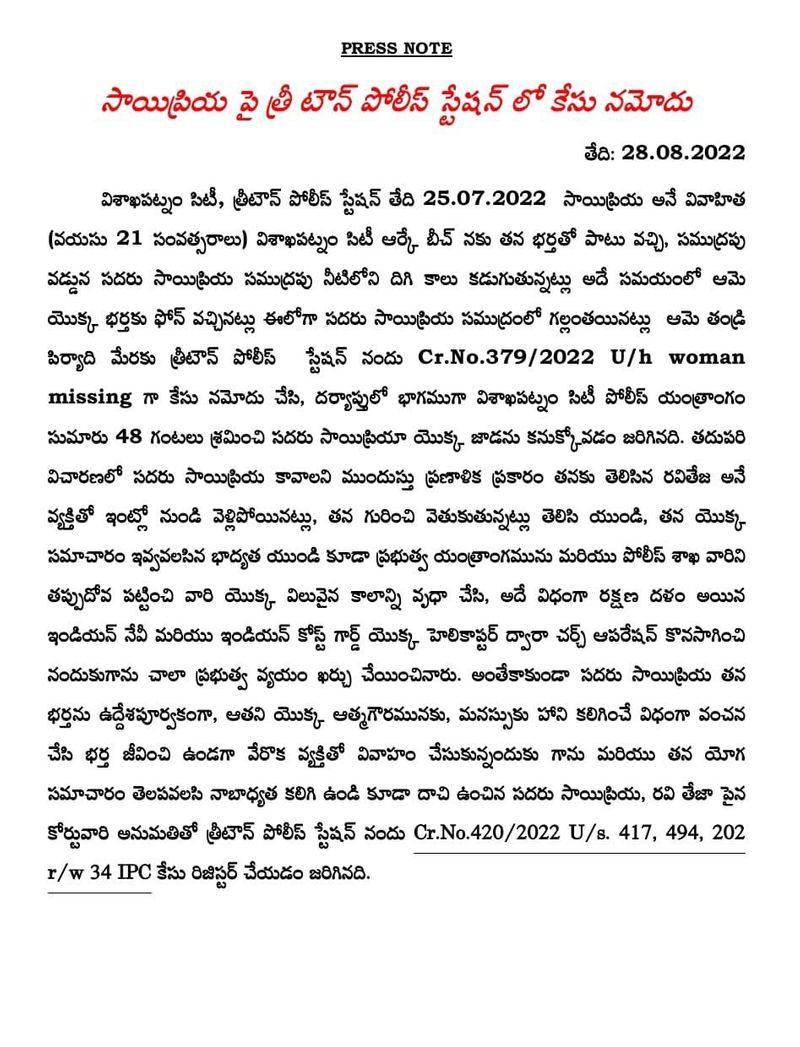 విశాఖపట్నంలో భర్తను బురిడి కొట్టించి.. ప్రియుడితో వెళ్లిపోయిన సాయిప్రియ కేసులో కొత్త ట్విస్ట్ చోటుచేసుకుంది. పోలీసులను, ఇతర ప్రభుత్వ శాఖలను తప్పుదోవ పట్టించినందుకు సాయిప్రియ, ఆమె ప్రియుడు రవితేజపై విశాఖపట్నం త్రీ టౌన్ పోలీసులు కేసు నమోదు చేశారు. కోర్టు అనుమతితో పోలీసులు సాయిప్రియ, రవితేజలపై ఐపీసీ సెక్షన్ 417, 494, 202 ఆర్/డబ్ల్యూ 34 కింద ఆదివారం కేసు నమోదు చేశారు. ఈ మేరకు పోలీసులు వివరాలను వెల్లడించారు. ఇక, ఎన్ఏడీ జంక్షన్కు చెందిన శ్రీనివాసరావు, సాయిప్రియ దంపతులు జూలై 25న ఆర్కే బీచ్కు వచ్చారు. బీచ్లో కాసేపు గడిపిన తర్వాత.. ఆ దంపతులు నీటిలో ఆడుకోవడం ప్రారంభించారు.