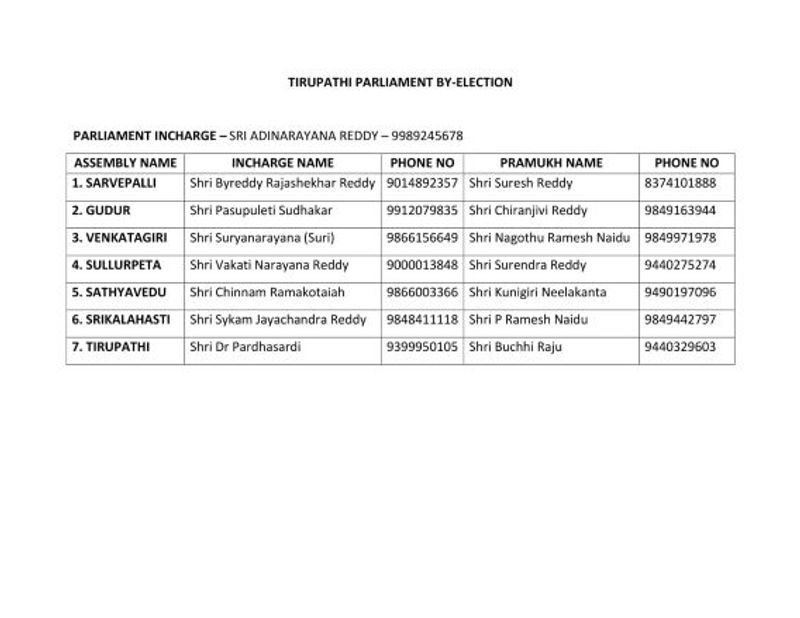 తిరుపతి ఉప ఎన్నికలో గెలుపు కోసం రెండంచెల కమిటీని ఏర్పాటు చేస్తామని వీర్రాజు పేర్కొన్నారు. తిరుపతి పార్లమెంట్ కమిటీ పార్లమెంట్ ఇంచార్జిగా ఆదినారాయణ రెడ్డిని నియమిస్తున్నట్లు వీర్రాజు తెలిపారు. ఇక ఈ పార్లమెంట్ పరిధిలోని అసెంబ్లీలకు కూడా ఇంచార్జీలను నియమించారు.