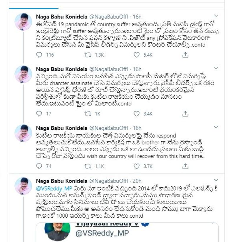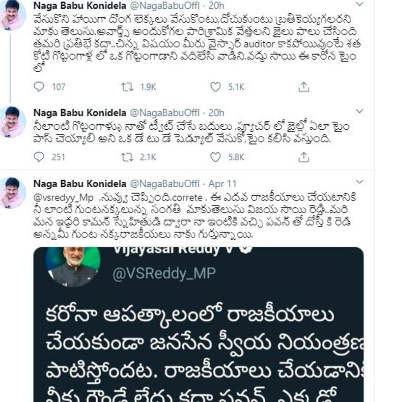 దీనికి మరల నాగబాబు కూడా రిప్లై ఇచ్చాడు. "మీరు మా ఇంటికి వచ్చింది 2014 లో కాదు2019 లో ఎలక్షన్స్ కి ముందు.మన కామన్ ఫ్రెండ్ ద్వారా వచ్చారు..మేము సాధారణ మైన వ్యక్తులం.మాకు సినిమాలు టీవీ షో లు చేయకుంటే కుటుంబాలు పోషించలేము.మీకు ఆ అవసరం లేదనుకోండి మంది సొమ్ము బాగా మెక్కారు గా.ఇంకో 1000 ఇయర్స్ కాలు మీద కాలు"..... "వేసుకొని హాయిగా దొంగ లెక్కలు వేసుకొంటు,దోచుకుంటు బ్రతికెయ్యగలరని మాకు తెలుసు.అవార్డ్స్ అందుకోగల పారిశ్రామిక వేత్తలని జైలు పాలు చేసింది తమరి ప్రతిభే కదా..చిన్న విషయం మీరు వైస్సార్ ఆడిటర్ కాకపోయివుంటే శత కోటి గొట్టంగాళ్ల లో ఒక గొట్టంగాడాని వదిలేసి వాడిని.వద్దు సాయి ఈ కారోన టైం లో"...."నీలాంటి గొట్టంగాళ్ళు నాతో ట్వీట్ చేసే బదులు ,ఫ్యూచర్ లో జైల్లో ఏలా టైం పాస్ చెయ్యాలి అని ఒక డే టు డే షెడ్యూల్ వేసుకో,టైం కలిసి వస్తుంది." అని వరుస ట్వీట్లతో విరుచుకుపడ్డారు.