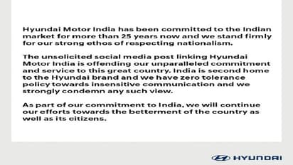 25 ఏళ్లుగా భారతీయులతో బంధం పెనవేసుకున్నామని, వారిని బాధపెట్టే విషయాలను తాము ఎన్నడూ సహించబోమంటూ క్షమాపణలు కోరింది. వెంటనే పాకిస్తాన్ విభాగం చేసిన ట్వీట్ ను తొలగించింది. దక్షిణ కొరియాకు చెందిన హ్యుండయ్ మోటార్స్ 25 ఏళ్లుగా భారత్ లో కార్యకలాపాలు సాగిస్తుంది. కార్ల అమ్మకాల్లో సంస్థకు భారత్ రెండో అతిపెద్ద మార్కెట్. హ్యుండయ్ అనుబంధ సంస్థ అయిన కియా మోటార్స్ కూడా భారత్ లో కార్యకలాపాలు సాగిస్తుంది. భారత్ నుంచే దక్షిణ అమెరికా దేశాలకు, మధ్య ఆసియ దేశాలకు కార్లను ఎగుమతి చేస్తుంది హ్యుండయ్ సంస్థ.