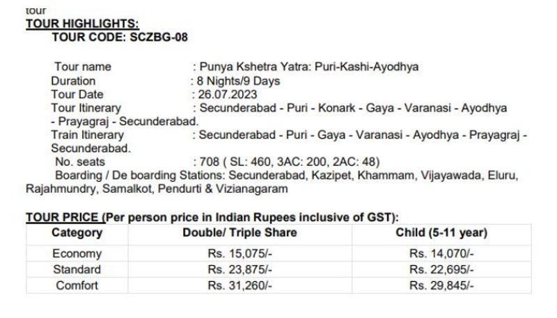 డబుల్/ట్రిపుల్ షేరింగ్ కోసం ఒక్కొక్కరికి రూ. 15,075 (స్లీపర్ క్లాస్), రూ. 23,675 (3-AC) , రూ. 31,260 (2-AC)తో బుక్ చేసుకోవచ్చు. స్లీపర్ క్లాస్కు రూ.14,070, థర్డ్ ఏసీకి రూ.22695, పిల్లలకు (5 నుంచి 11 ఏళ్లలోపు) అదే ఛార్జీ రూ.29,845. రాత్రిపూట బస చేయడానికి హోటల్, అల్పాహారం, భోజనం, ప్రయాణ బీమా , స్థానిక రవాణాతో సహా అన్నీ ఈ టూర్ ప్యాకేజీ కింద కవర్ చేయబడతాయి. దీని కోసం మీ నుండి ఎటువంటి అదనపు ఛార్జీ తీసుకోరు.