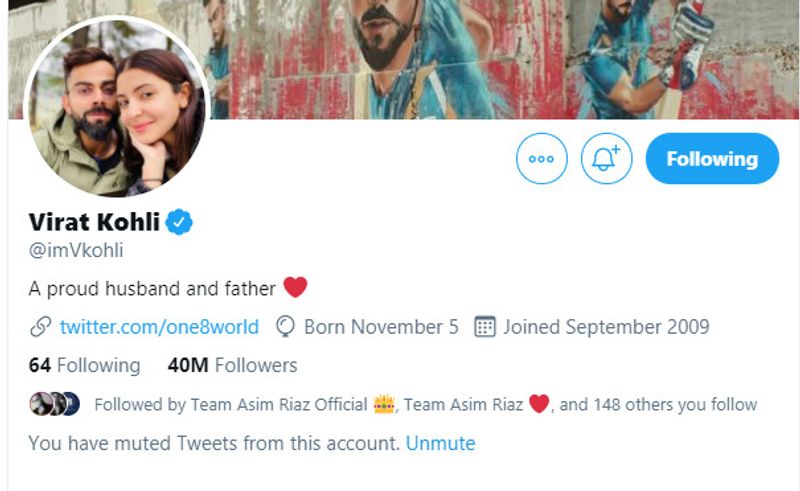 కోహ్లీ సతీమణి అనుష్క శర్మ ఓ ఆడబిడ్డకు జన్మనిచ్చిన సంగతి తెలిసిందే. కూతురు పుట్టిన తర్వాత విరాట్ కోహ్లీ తన ట్విట్టర్ ఖాతా బయోని మార్చేశాడు. ఇంతకుముందు ట్విట్టర్లో కోహ్లీకి... ‘ది అఫిషియల్ ట్విట్టర్ ఆఫ్ విరాట్ కోహ్లీ, ఇండియన్ క్రికెటర్, గేమర్, కార్ లవర్, లవ్స్ సాకర్ అండ్ అన్ ఎంతూజియాస్టిస్ట్గ’ అని బయోలో ఉండేది.