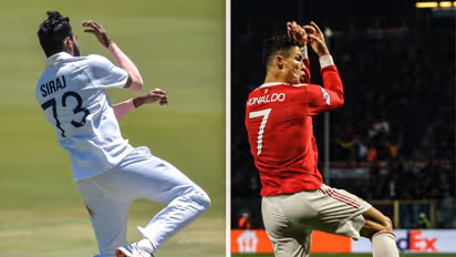 దక్షిణాఫ్రికా ఇన్నింగ్స్ లో ఆ జట్టు నాలుగో స్థానంలో బ్యాటింగ్ కు వచ్చిన డసెన్ ను సిరాజ్ ఔట్ చేశాడు. ఇన్నింగ్స్ 12.5 ఓవర్లో సిరాజ్ బౌలింగ్ లో అతడు.. అజింక్యా రహానే కు క్యాచ్ ఇచ్చి వెనుదిరిగాడు. దీంతో సిరాజ్.. రొనాల్డో మాదిరిగా సంబురాలు జరుపుకున్నాడు. గోల్ కొట్టిన తర్వాత రొనాల్డో.. పిడికిలి బిగించి కుడి చేతిని భూమివైపునకు బలంగా లాగుతాడు.