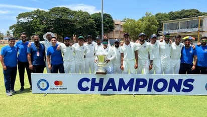 దులీప్ ట్రోఫీ ఫైనల్లో వెస్ట్ జోన్ ఘన విజయం సాధించింది. 529 పరుగుల భారీ లక్ష్యాన్ని ఛేదించే క్రమంలో సౌత్ జోన్ సగం పరుగులు కూడా చేయలేకపోయింది. ప్రధాన బ్యాటర్లంతా విఫలం కావడంతో 234 పరుగుల వద్దే ఆలౌట్ అయింది. ఫలితంగా వెస్ట్ జోన్.. 294 పరుగుల భారీ ఆధిక్యంతో గెలిచి దులీప్ ట్రోపీని చేజిక్కించుకుంది. కోయంబత్తూరు వేదికగా ఆదివారం ముగిసిన ఈ మ్యాచ్ లో నాలుగో రోజు ఓవర్ నైట్ స్కోరు 154-6 వద్ద ఐదో రోజు ఆరంభించిన సౌత్ జోన్.. మరో 80 పరుగులు మాత్రమే జోడించింది. సాయి కిషోర్ (7) నిరాశపరిచాడు.