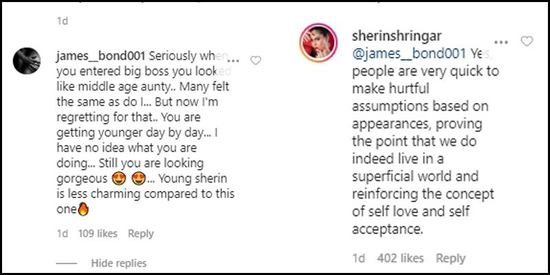 షెరీన్ అతడికి రిప్లై ఇచ్చింది. 'అవును, కొంతంది రూపాన్ని చూసి భాదని కలిగించేలా కెమెంట్స్ చేస్తుంటారు. కానీ తెలుసుకోవలసింది ఏమిటంటే మనం భూమిపై జీవించే ఆత్మాభిమానం, మనల్ని మనం అభిమానించుకునే మనుషులం అని' అంటూ షెరీన్ రిప్లై ఇచ్చింది.
