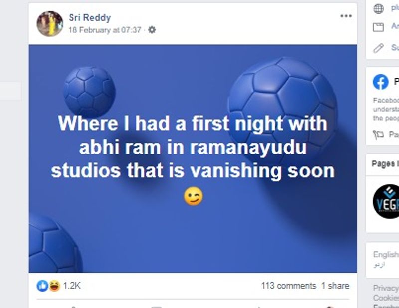 అయితే రీసెంట్ గా శ్రీ రెడ్డి చేసిన మరొక కామెంట్ సోషల్ మీడియాలో హాట్ టాపిక్ గా మారింది. అభిరామ్ తో తన ఫస్ట్ నైట్ రామానాయుడు స్టూడియోలో జరిగినట్లు చెబుతూ.. ఆ ప్లేస్ త్వరలోనే మాయం కానుందని శ్రీ రెడ్డి సోషల్ మీడియా ద్వారా కామెంట్ చేసింది. దీంతో ఆ పోస్ట్ నేషనల్ మీడియాని కూడా తాకింది. ఇటీవల రామానాయుడు స్టూడియో అమ్మకానికి పెట్టినట్లు వార్తలు వచ్చిన విషయం తెలిసిందే.