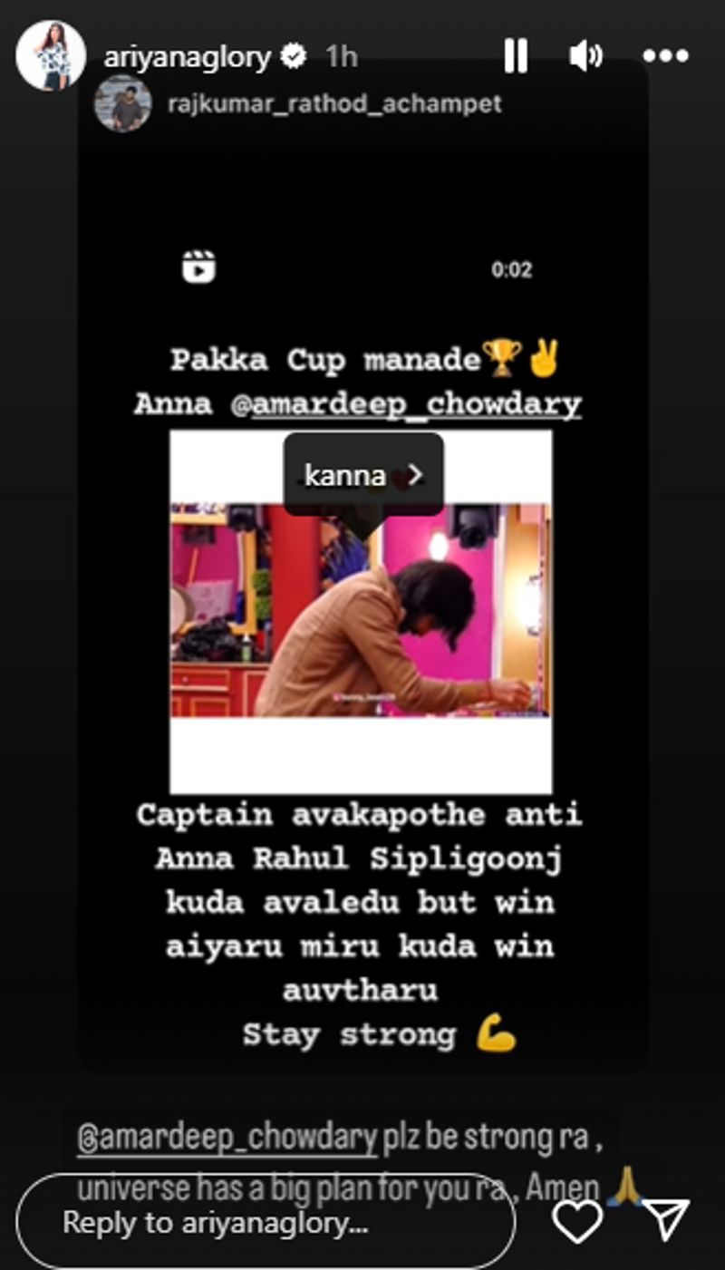 దీనితో అరియనా రీపోస్టు చేస్తూ.. ప్లీజ్ స్ట్రాంగ్ గా ఉండరా.. ఈ యూనివర్స్ నీ కోసం మరిన్ని పెద్ద ప్లాన్స్ తో ఉంది అని కామెంట్స్ చేసింది.సీజన్ 7 లో శివాజీ, ప్రశాంత్, ప్రియాంక, శోభా శెట్టి బలమైన కంటెస్టెంట్స్ గా ఉన్నారు. అమర్ దీప్ కూడా గట్టిగా పోరాడుతున్నాడు.