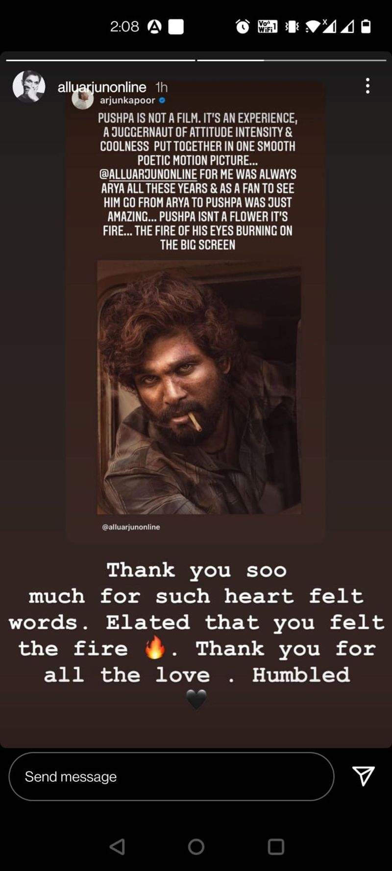 ఇదిలా ఉండగా పుష్ప చిత్రంపై సెలెబ్రిటీల నుంచి ప్రశంసలు వెల్లువెత్తుతున్నాయి. తాజాగా బాలీవుడ్ క్రేజీ నటుడు అర్జున్ కపూర్ పుష్ప చిత్రంపై ప్రశంసలు కురిపించాడు. అల్లు అర్జున్ నటనని కొనియాడాడు. పుష్ప చిత్రం వీక్షించిన తర్వాత అర్జున్ కపూర్ సోషల్ మీడియాలో పోస్ట్ పెట్టాడు.