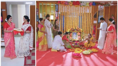 ఇంతలోనే వసుధార, రిషి ఇద్దరు ఆ కొత్త బట్టలతో రావడంతో అది చూసి మహేంద్ర వాళ్ళ సంతోషపడుతుండగా దేవయాని షాక్ అవుతుంది. ఇప్పుడు జగతి, మహేంద్ర ఒకరినొకరు చూసుకుంటూ సంతోషపడుతూ ఉంటారు. అప్పుడు దేవయాని రండి రిషి వచ్చి పీటల మీద కూర్చుండి అనడంతో మేము పీటల మీద కూర్చోవడం లేదు పెద్దమ్మ అని అంటాడు. అప్పుడు అందరూ షాక్ అవుతారు. మరి ఎవరు కూర్చుంటారు అనగా డాడ్ మేడం మీరు కూర్చోండి అని అంటాడు. ఆ మాటకు దేవయాని షాక్ అవుతుంది. డాడ్ ప్లీజ్ చెప్పింది వినండి మీరు మేడం గారు కలిసి పీటల మీద కూర్చొని పూజ చేయండి అని అంటాడు రిషి. వాళ్లు కూర్చోవడం ఏంటి రిషి అనగా ఈ విషయం గురించి నేను మీతో తర్వాత మాట్లాడతాను పెద్దమ్మ. డాడ్ మీరు వెళ్లి కూర్చోండి అనడంతో జగతి మహేంద్ర పూజలో కూర్చుంటారు. దాంతో దేవయాని షాక్ అవుతుంది. ఆ తర్వాత అందరూ పూజలో కూర్చోగా అప్పుడు రిషి వసు గదిలో మాట్లాడుకున్న మాటలను గుర్తు చేసుకుంటూ ఉంటారు.