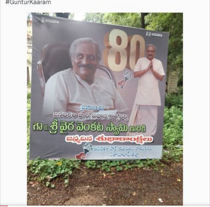 ఇక్కడ మీరు చూస్తున్న ఈ ఫొటోలో సీనియర్ నటుడు ప్రకాశ్ రాజ్ రాజకీయ నాయకుడిగా ఓ ఫ్లెక్సీ కనపడుతోంది. ఇది గుంటూరు కారం సినిమాలోని పోస్టర్ అని చెబుతున్నారు. ఈ ఫ్లెక్సీలో 'ప్రజాబంధు జనదళం పార్టీ ప్రధాన కార్యదర్శి శ్రీ వైర వెంకట స్వామి గారికి జన్మదిన శుభాకాంక్షలు. జనదళం పార్టీ యువజన నాయకులు నిజమాబాద్ జిల్లా' అని అందులో రాసి ఉంది. అంటే ప్రకాశ్ రాజ్.. శ్రీ వైర వెంకట స్వామి అనే రాజకీయ నేతగా కనిపిస్తారని తెలుస్తోంది.