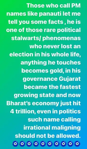 మోదీని పనౌటీ అని పిలుచుకునే వారు కొన్ని వాస్తవాలు తెలుసుకోవాలి.. తన జీవితంలో ఎన్నడూ ఎన్నికల్లో ఓడిపోని అరుదైన రాజకీయ దిగ్గజాలలో మోదీ కూడా ఒకరు. ఆయన తాకినదేదైనా బంగారం అవుతుంది, ఆయన పాలనలో గుజరాత్ అత్యంత వేగంగా అభివృద్ధి చెందుతున్న రాష్ట్రంగా అవతరించింది. అంతే కాదు ఆయన ప్రభాదిగా.. ఇప్పుడు భారత్ ఆర్థిక వ్యవస్థ కేవలం 4 ట్రిలియన్లను తాకింది, రాజకీయాల్లో కూడా ఆయన పాటించే విలువలు అద్భుతం. అందుకే దుష్ప్రచారాన్ని మానండి అని కంగనా తన ఇన్స్టాగ్రామ్ స్టోరీలో రాసింది. ప్రస్తుతం ఈ పోస్ట్ వైరల్ అవుతోంది.