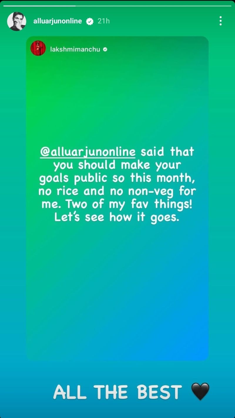 ఈ క్రమంలో అల్లు అర్జున్ తాజాగా ఓ పోస్ట్ పెట్టారు. ఇన్ స్టా హ్యాండిల్ ద్వారా ఇంట్రెస్టింగ్ మూమెంట్ ను షేర్ చేసుకున్నారు.. అదేంటంటే... రీసెంట్ గా అల్లు అర్జున్ స్టార్ కిడ్ మంచు లక్ష్మి ఓ టాస్క్ ఇచ్చారు. న్యూ ఇయర్ సందర్భంగా నీ గోల్స్ ను పబ్లిక్ తో ఓపెన్ గా షేర్ చేసుకోవాలని సూచించాడు. ఈ ఛాలెంజ్ ను మంచు లక్ష్మి అంగీకరించింది. ఈ సందర్భంగా సోషల్ మీడియా ద్వారా ఆ విషయాన్ని షేర్ చేసింది.