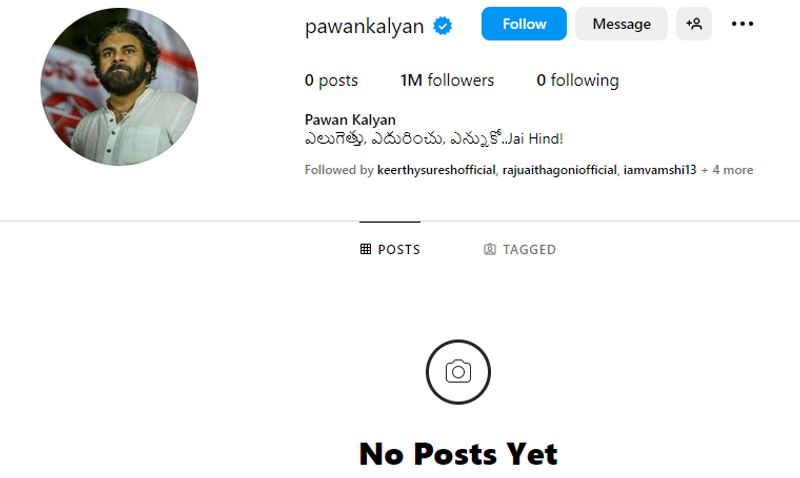 చాలా వరకు ఇన్స్టాగ్రామ్ని పర్సనల్ విషయాలకే వాడుతుంటారు. ఫ్యామిలీ, సినిమాలు, పర్సనల్ ఫోటోలు, వీడియోలు పంచుకుంటారు. రీల్స్ చేస్తుంటారు. అయితే పవన్ ఆ టైమ్ కాదు, మరి ఆయన ఎలాంటి పోస్ట్ లు పెడతారనేది ఇప్పుడు ఆసక్తికరంగా మారింది. ఆయన సినిమాల గురించి పెడతారా? ఎప్పటిలాగే తన రాజకీయ పోస్ట్ లు పెడతారా? అనేది ఆసక్తికరంగా మారింది.ఎంట్రీ ఇచ్చిన తర్వాత ఆయన ఒక్క పోస్ట్ కూడా పెట్టలేదు. మొదటి పోస్ట్ ఏం ఉండబోతుందనేది అందరిలోనూ ఆసక్తి నెలకొంది. ఇక ప్రొఫైల్లో మాత్రం `ఎలుగెత్తు, ఎదురించి, ఎన్నుకో జై హింద్`అనే నినాదాన్ని పంచుకున్నారు.