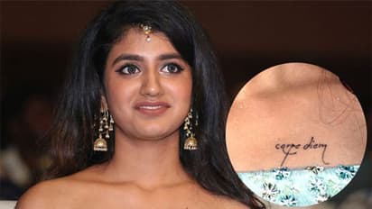'Carpe Diem'ప్రియా ఎదపై ఉన్న టాటూ ఇదే.. ఇది లాటిన్ భాషకి చెందిన పదం. దీనికి అర్ధమేంటంటే.. 'ఫ్యూచర్ మీద చిన్న ఆశ, నమ్మకంతో నేడు జీవించండి'.దీన్నే టాటూగా వేయించుకుంది ఈ బ్యూటీ.