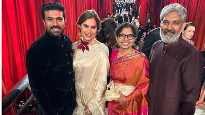 రాంచరణ్ బ్లాక్ సూట్ లో ఆస్కార్ వేడుకకి హాజరయ్యారు. ఇక చరణ్ సతీమణి ఉపాసన సాంప్రదాయ చీరకట్టులో మెరిసింది. ఆర్ఆర్ఆర్ చిత్రం ఆస్కార్ అవార్డు గెలిచిన తర్వాత రాంచరణ్, ఉపాసన మీడియాతో మాట్లాడారు. ఉపాసన మాట్లాడుతూ ఆర్ఆర్ఆర్ ఫ్యామిలిలో భాగంగా నేను కూడానా వచ్చాను. ఇంతలో రాంచరణ్ అందుకు తాను 6 నెలల గర్భవతి. పుట్టబోయే బిడ్డకు ఇప్పుడే చాలా ప్రేమ లభిస్తోంది. కడుపులో ఉండగానే ఆ బిడ్డ మాకు అదృష్టాన్ని తెచ్చిపెడుతోంది అంటూ రాంచరణ్ తన సంతోషాన్ని తెలిపాడు.
