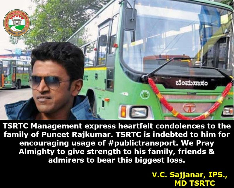 2019లో పునీత్ రాజ్ కుమార్ బీఎంటీసీకి బ్రాండ్ అంబాసిడర్ గా నియమించబడ్డారు. ఈ సేవలని సజ్జనార్ గుర్తు చేసుకుంటూ.. పబ్లిక్ ట్రాన్స్ పోర్ట్ ని ఎంకరేజ్ చేసినందుకు గాను పునీత్ ని అభించారు. తాజాగా ఆయన మృతిపట్ల తీవ్ర విచారం వ్యక్తం చేసిన సజ్జనార్.. పునీత్ కుటుంబ సభ్యులకు ప్రగాఢ సానుభూతి తెలియజేశారు. తెలంగాణ ఆర్టీసీ తరుపున పునీత్ మృతికి సంతాపం తెలియజేస్తూ ప్రెస్ నోట్ కూడా విడుదల చేశారు.