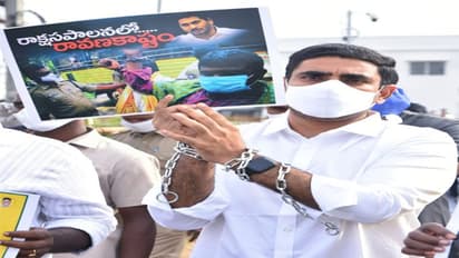 అమరావతి: అసెంబ్లీ సమావేశాలు ప్రారంభమైనప్పటి నుండి తెలుగుదేశం పార్టీ ఏదో ఒక విషయంపై నిరసనకు దిగుతున్న విషయం తెలిసిందే. నిన్న(బుధవారం) వైసిపి హయాంలో ఇసుకను బంగారమయ్యిందంటూ నిరసనకు దిగిన టిడిపి ఇవాళ మీడియాపై ఆంక్షలపై నిరసనకు దిగారు. ఇందులో భాగంగా టిడిపి జాతీయ ప్రధాన కార్యదర్శి, ఎమ్మెల్సీ నారా లోకేష్ సంకెళ్లతో అసెంబ్లీకి చేరుకున్నారు. ఆయనతో పాటు మిగతా టిడిపి ఎమ్మెల్యేలు, ఎమ్మెల్సీలు కూడా నిరసనలో పాల్గొన్నారు.