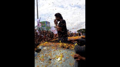 బన్నీని చూసేందుకు పెద్దఎత్తున అభిమానులు చేరుకున్నారు. కారుపై నిల్చుని బన్నీ అభిమానులకు అభివాదం చేశాడు. బన్నీ వెంట అభిమానులు ర్యాలీగా బయలుదేరారు.