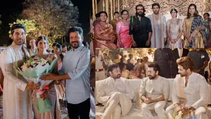 అల్లు శిరీష్, నయనికల వెడ్డింగ్ కి తెలంగాణ సీఎం రేవంత్ రెడ్డి హాజరయ్యారు. పుష్పగుచ్ఛం ఇచ్చి నూతన వధువరులను ఆశీర్వదించారు. రేవంత్ కు అల్లు అర్జున్ ఘన స్వాగతం పలికారు.. ఈ ఇద్దరు చాలా క్లోజ్ గా మాట్లాడుతూ కనిపించారు. రేవంత్ రెడ్డి కూడా అల్లు అరవింద్ చేయి పట్టుకుని.. ఆప్యాయంగా మాట్లాడారు. కొద్ది సేపు చిరంజీవితో కూడా ముచ్చటించారు రేవంత్. ఈ పెళ్లిలో నూతన వధువరులు అల్లు శిరీష్, నయనికలతోపాటు సీఎం రేవంత్ రెడ్డి, సినిమాటోగ్రఫీ మంత్రి కోమటిరెడ్డి వెంకట్ రెడ్డి కూడా ఉన్నారు.