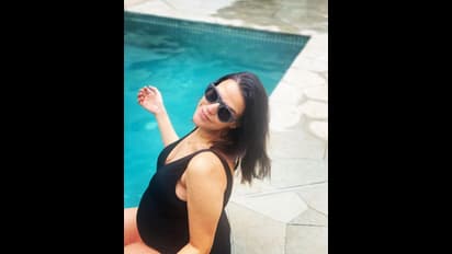 బ్లాక్ బికినీలో గాగుల్స్ ధరించి పూల్ పక్కన కూర్చుని ఉన్న స్టిల్స్ బోల్డ్ గా ఉన్నాయి. గతంలో సమీరా రెడ్డి కూడా గర్భంతో ఉన్నప్పుడు బికినీ ఫోటోస్ కి ఫోజులు ఇచ్చింది.