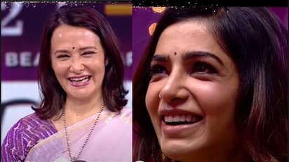అమలని రోజా కొన్ని ఆసక్తికర ప్రశ్నలు అడిగింది. అక్కినేని హీరోలు నాగార్జున, నాగచైతన్య, అఖిల్ కలిసి ఉన్న ఫోటోని చూపిస్తూ వీరిలో ఎవరు ఎక్కువ లేజీ అని రోజా అమలని ప్రశ్నించారు. అమల సమాధానమిస్తూ వాళ్లకంటే నేనే ఎక్కువ లేజీ అని సరదాగా బదులిచ్చింది. రోజా మరో ప్రశ్న అడిగారు.. ఈ ముగ్గురిలో ఎవరు మోస్ట్ హ్యాండ్సమ్ అని ప్రశ్నించింది. కానీ అమల సమాధానం చెప్పకుండా సిగ్గుపడుతూ కనిపించారు. వేదికపై అమలు సిగ్గుపడుతుండగా.. వేదిక కింద సమంత నవ్వుతూ ఉన్నట్లు చూపించారు. ఆ తర్వాత అమల హలో గురు ప్రేమకోసమే సాంగ్ కి డాన్స్ కూడా చేశారు.