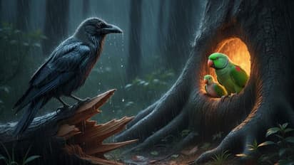 వర్షం కారణంగా తాను నివసిస్తున్న చెట్టు కూలిపోయిందని, దయచేసి ఈ రోజు రాత్రికి ఆశ్రయం కల్పించమని కాకి, చిలకను కోరుతుంది. దీంతో కాకిని ఇంట్లోని ఆహ్వానిస్తుంది చిలక. తడిసి వచ్చిన కాకికి టవల్ ఇచ్చి వేడి వేడి భోజనం పెట్టి. పడుకోమని గదిని చూపిస్తుంది.