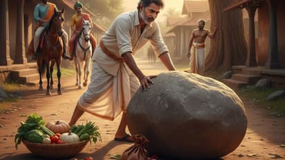 కొంతసేపటికి ఒక రైతు కూరగాయల బరువుతో అక్కడికి చేరుకున్నాడు. బండరాయి చూసి ఆగిపోయాడు. “ఇది ఇక్కడ ఉంటే ఎంతో మంది ఇబ్బంది పడతారు” అని అనుకున్నాడు. తన బరువును కింద పెట్టి, బండరాయిని తోసేందుకు ప్రయత్నించాడు. మొదట కదల్లేదు, చెమటలు పట్టాయి, శక్తి తగ్గింది. కానీ కానీ అతను ఆపలేదు. చివరకు తీవ్రంగా శ్రమించి బండరాయిని పక్కకు జరిపాడు.