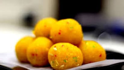 మోతిచూర్ లడ్డూ తయారీకి కావల్సిన పదార్థాలు: రెండు కప్పుల సెనగపిండి (Besan flour), కొద్దిగా ఫుడ్ కలర్ (Food colour), రెండు కప్పుల పంచదార (Sugar), కొంచెం యాలకుల పొడి (Cardamom powder), బాదం (Almonds), పిస్తా (Pista), కాజు (kaju), మూడు టేబుల్ స్పూన్ ల నెయ్యి (Ghee), ఢీ ఫ్రైకి సరిపడు ఆయిల్ (Oil).