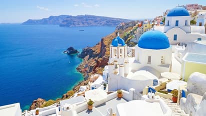 శాంటోరిని : తెల్లటి ఇళ్లు, నీలి గుమ్మటాల చర్చిలు, ఏజియన్ సముద్రంలో అద్భుతమైన సూర్యాస్తమయాలకు ప్రసిద్ధి.