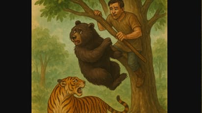 దీంతో పులి ఈ సారి వేటగాడిని టార్గెట్ చేస్తుంది. అతనితో మాట్లాడుతూ.. 'నాకు బాగా ఆకలిగా ఉంది. నువ్వు ఆ ఎలుగు బంటిని కిందికి తోసేస్తే నిన్ను వదిలేస్తా. ఎంచక్కా మీ ఇంటికి వెళ్లిపోవచ్చు' అని ఆశచూపుతుంది. దీంతో వేటగాడిలోని కన్నింగ్ నెస్ బయటపడుతుంది. పులి చెప్పినట్లుగానే ఎలుగుబంటిని కిందికి నెట్టేసే ప్రయత్నం చేస్తాడు.