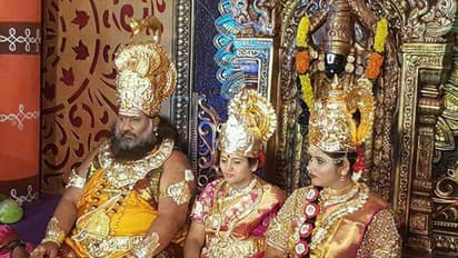 ఫెళ్లికొడుకు శ్రీనివాసుడిగా, పెళ్లి కూతురు పద్మావతి దేవి అలంకరణలో పెళ్లి పీటలపై కూర్చుని ఒక్కటయ్యారు. పెళ్లికి హాజరై ఇది చూసినవారు నిజంగా దేవతల పెళ్లి జరుగుతుందా అన్న ఆశ్అశ్చర్యానికి గురయ్యారు. వధూవరులే కాదు పెళ్లి పెద్దలు కూడా ఇదే పౌరాణిక అలంకరణలో కనిపించి పెళ్లి జరిపించారు. మొత్తానికి భువిపై దేవతల పెళ్లి జరుగుతుందా అన్నంతలా అంగరంగవైభవంగా ఈ పెళ్లి జరిగింది.