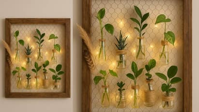 వాటర్ ప్లాంట్లతో గోడల్ని డెకరేట్ చేయడానికి ఫోటో ఫ్రేమ్లను వాడుకోవచ్చు. ఒక చెక్క ఫోటో ఫ్రేమ్ తీసుకొని, దానికి సన్నని మెటల్ జాలీని అమర్చాలి. ఇప్పుడు ఆ ఫ్రేమ్లో గాజు సీసాల్లో నీళ్లు పోసి రకరకాల మొక్కలను పెట్టొచ్చు. ఇంకా అందంగా కనిపించడానికి దానితో పాటు లైటింగ్ కూడా సెట్ చేయవచ్చు. లైట్లు వేసినప్పుడు ఆ మొక్కలు మరింత బ్యూటిఫుల్గా కనిపిస్తాయి.