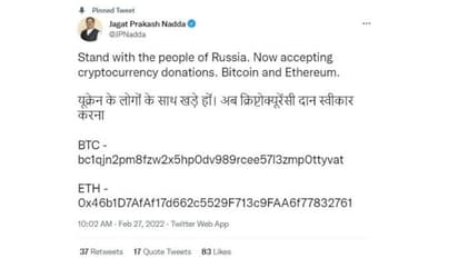 JP Nadda's Twitter: భారతీయ జనతా పార్టీ (బిజెపి) జాతీయ అధ్యక్షుడు జెపి నడ్డా ట్విట్టర్ ఖాతా హ్యాక్ చేయబడింది. వారి ప్రమేయం లేకుండా.. ఉక్రేనియన్ల కోసం క్రిప్టోకరెన్సీ విరాళాలు కోరుతూ ఆదివారం ఉదయం ఒక ట్వీట్ పోస్ట్ చేయబడింది.