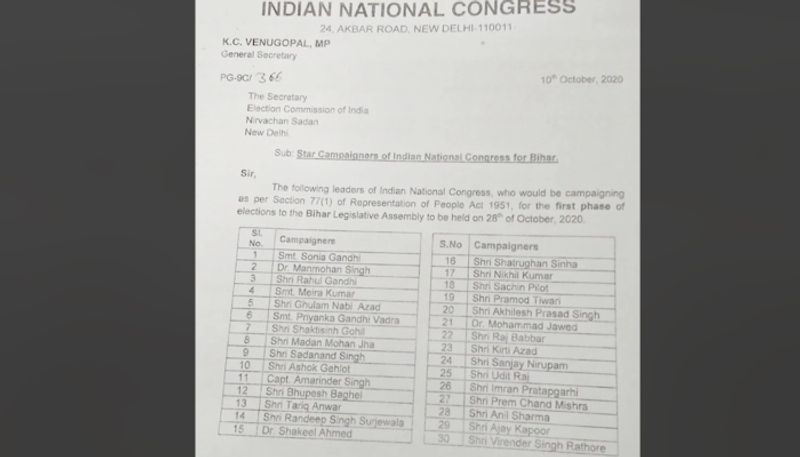 బిహార్లో ఎన్నికలకు సంబంధించి తొలి విడత పోలింగ్ ఈ నెల 28న జరగనుంది. దీంతో కాంగ్రెస్ పార్టీ స్పీడ్ పెంచింది. దీనిలో భాగంగా ప్రచారానికి 30 స్టార్ ప్రచారకుల జాబితాను శనివారం విడుదల చేసింది. ఈ మేరకు జాబితాను కేంద్ర ఎన్నికల సంఘానికి పంపించింది.