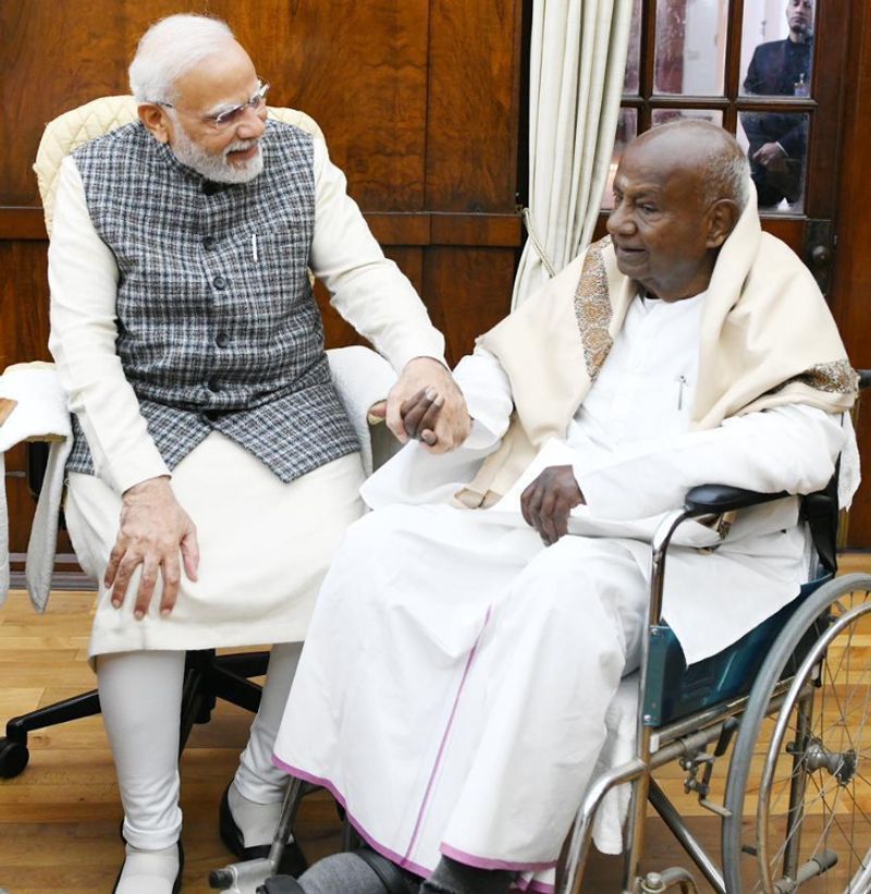 రెండో చిత్రం మాజీ ప్రధాని మోదీని హెచ్డీ దేవెగౌడ కలిసేందుకు వస్తున్న దృశ్యం. వీల్ చైర్లో ఉన్న దేవెగౌడతో ప్రధాని చాలా స్నేహపూర్వకంగా మాట్లాడారు. కర్ణాటకలో ఎన్నికలు జరగనున్న నేపథ్యంలో ఈ ఫొటో.. తీవ్రమైన చర్చకు దారితీసింది. అనంతరం దేవెగౌడ మీడియాతో మాట్లాడుతూ కర్ణాటకలో రెండు ప్రాంతీయ సమస్యలపై తాను ప్రధానితో చర్చించానని చెప్పారు. అయితే మోదీ- దేవెగౌడ సమావేశాన్ని చూసిన మరో నేతకు కొన్ని పాత రోజులు గుర్తుకువచ్చాయి.. అయితే 1996లో దేవెగౌడను భారత 11వ ప్రధానిగా ఎన్నుకున్న సమావేశంలో ఆ నేత కూడా ఉన్నారు.