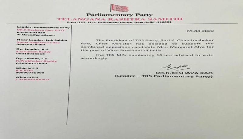రాష్ట్రపతి ఎన్నికల్లో మాదిరిగానే ఉపరాష్ట్రపతి ఎన్నికల్లోనూ ప్రతిపక్ష పార్టీల అభ్యర్థికే టీఆర్ఎస్ పార్టీ మద్దతు ప్రకటించింది. టీఆర్ఎస్ పార్టీ అధ్యక్షుడు కేసీఆర్ ఆదేశాల మేరకు మార్గరేట్ ఆళ్వాకే మద్దతిస్తున్నట్లు ఆ పార్టీ పార్లమెంటరీ లీడర్ కే. కేశవరావు ప్రకటించారు. కాబట్టి 16మంది టీఆర్ఎస్ ఎంపీలో పార్టీ ఆదేశానుసారం మార్గరేట్ కు ఓటేయాలని సూచించారు.