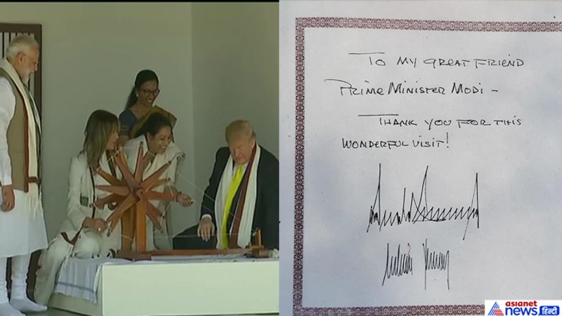 విజిటర్స్ బుక్ లో డోనాల్డ్ ట్రంప్ సంతకం చేశారు. "నా గ్రేట్ ఫ్రెండ్ ప్రైమ్ మినిస్టర్ మోడీ... థ్యాంక్యూ ఫర్ దిస్ వండర్ ఫుల్ విజిట్" అని ట్రంప్ విజిటర్స్ బుక్ లో రాసి కింద సంతకం చేశారు. విజిటర్స్ బుక్ లో ట్రంప్ మహాత్మా గాంధీని ప్రస్తావించలేదు. ఆశ్రమం వద్ద ట్రంప్ దంపతులకు మోడీ, గుజరాత్ ముఖ్యమంత్రి విజయ్ రూపాని స్వాగతం పలికారు.