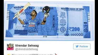 కోహ్లీ ట్రిపుల్ డబుల్ కొట్టిన నేపథ్యంలో అతడి డబుల్ సెంచరీకి గుర్తుగా కొత్త రూ. 200 నోట్లు ముద్రించాల్సిందిగా కేంద్రానికి వీరూ ట్విటర్ లో ప్రతిపాదన చేశారు.