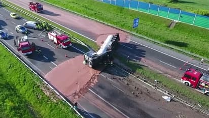 రెస్నియా నుంచి స్లుప్కా వెళ్లే నేషనల్ హైవే ఏ2 మధ్యలో ఈ ఘటన చోటు చేసుకున్నది. రోడ్డు మధ్యలో ఉన్న ట్రాఫిక్ బారికేడ్ను ఢీకొన్న లారీ బోల్తా పడింది. ఇక.. ఆ దారి గుండా వెళ్లిన మిగితా వాహనాల టైర్లన్నీ చాకొలేట్ లిక్విడ్ మరకలతో అలాగే రోడ్డు మీద వెళ్లడంతో కొన్ని కిలోమీటర్ల వరకు ఈ చాకొలేట్ లిక్విడ్ విస్తరించింది.