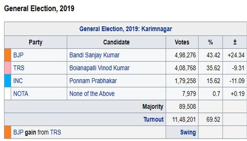 పార్లమెంటు ఎన్నికల్లో తెరాస కు అసెంబ్లీ ఎన్నికలతో పోల్చుకుంటే ఓట్లు గణనీయంగా తగ్గాయి. ఉదాహరణకు కరీంనగర్ పార్లమెంటరీ స్థానాన్ని తీసుకుందాము. అక్కడ ఒక్క బీజేపీ ఎమ్మెల్యే కూడా గెలవలేదు. తెరాస బాస్ కెసిఆర్ కుమారుడు కేటీఆర్ ప్రాతినిధ్యం వహిస్తున్న సిరిసిల్ల నియోజకవర్గం కూడా ఈ పార్లమెంటు స్థానం పరిధిలోకే వస్తుంది. ఇంకో సీనియర్ మంత్రి ఈటెల రాజేందర్ ప్రాతినిధ్యం వహించే హుజురాబాద్ నియోజకవర్గం కూడా ఈ పార్లమెంటు స్థానం పరిధిలోకే వస్తుంది.