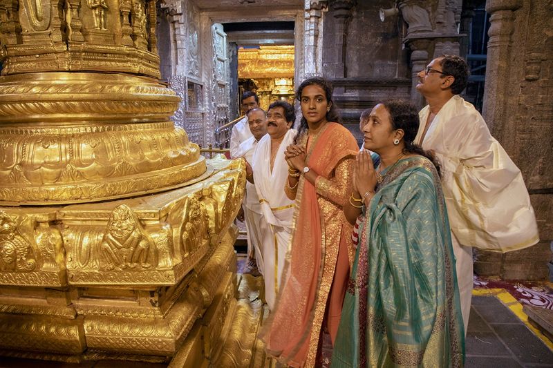 నిన్న రాత్రే తిరుమలకు చేరుకున్న సింధుకు టిటిడి అధికారులు స్వాగతం పలికారు. వరల్డ్ బ్యాడ్మింటన్ చాంఫియన్షిప్ లో మొదటి గోల్ట్ మెడల్ సాధించిన ఆమెను వారు అభినందించారు. ఇలా రాత్రే తిరుచానూరు అమ్మవారితో పాటు అప్పలాయగుంట ప్రసన్న వెంకటేశ్వర స్వామిని వీరు దర్శించుకున్నారు. ఈ తర్వాతజీఎంఆర్ అతిథి గృహంలో బస చేశారు.