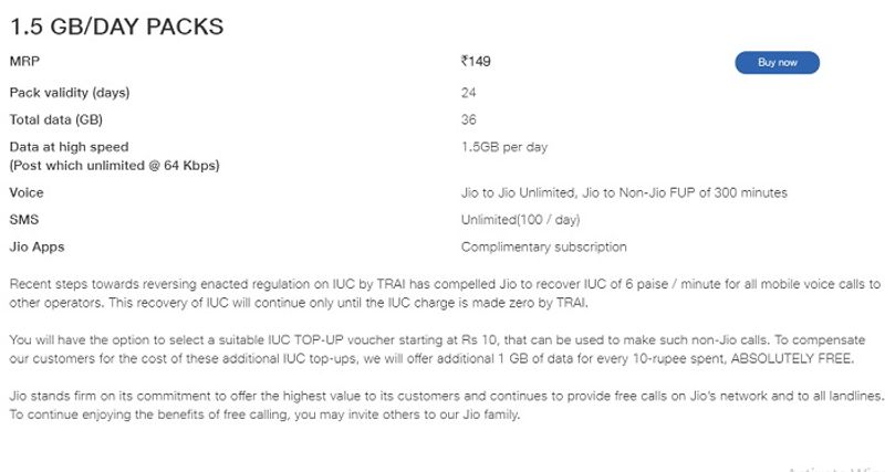జియో నెట్వర్క్ కాంప్లిమెంటరీ కింద జియో యాప్స్ సుబ్స్క్రిప్షన్ కూడా అందిస్తుంది. కంపెనీ వెబ్సైట్లో ఈ ప్లాన్ వివరాలను వెల్లడించింది.రిలయన్స్ జియో ఇటీవల జియో నుండి ఇతర ఆపరేటర్ల అన్ని మొబైల్ వాయిస్ కాల్లపై నిమిషానికి 6 పైసలు ఛార్జీ చేసింది. అయితే TRAI ఛార్జ్ సున్నా అయ్యే వరకు మాత్రమే IUC రికవరీ కొనసాగుతుందని పేర్కొంది.