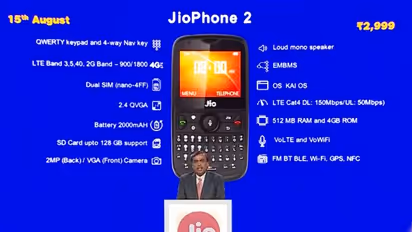 జియో ఫోన్ 2 ధర రూ.2,999 గా నిర్ణయించినట్లు ముకేష్ వెల్లడించారు. ఈ ఫోన్ ఆగస్టు 15వ తేదీ నుంచి మార్కెట్లోకి అందుబాటులోకి వస్తుందన్నారు. అలాగే ఈ నెల 21వ తేదీ నుంచి ఈ ఫోన్కు గాను బుకింగ్స్ ప్రారంభమవుతాయని, ఇప్పటికే జియో ఫోన్ను వాడేవారు ఆ ఫోన్ను ఇచ్చేసి రూ.501 అదనంగా చెల్లిస్తే దాంతో జియో ఫోన్ 2 ను సొంతం చేసుకోవచ్చని తెలిపారు. జియో ఫోన్ మాన్సూన్ హంగామా ఆఫర్ కింది ఎక్స్ఛేంజ్ను అందిస్తున్నట్లు తెలిపారు.