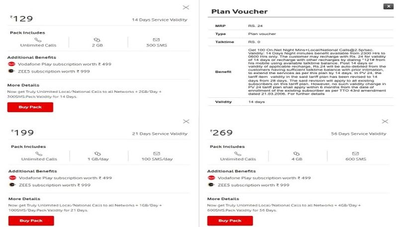 కొత్త వోడాఫోన్ రూ. 199 ప్లాన్ 21 రోజుల వాలిడిటీతో ఆన్లిమిటెడ్ కాలింగ్తో పాటు 1GB డేటా అలవెన్స్తో పాటు రోజుకు 100 ఎస్ఎంఎస్ లను అందిస్తుంది. ఇక వినియోగదారులకు వోడాఫోన్ ప్లే మరియు జీ5 సబ్స్క్రిప్షన్ కూడా అందిస్తుంది.