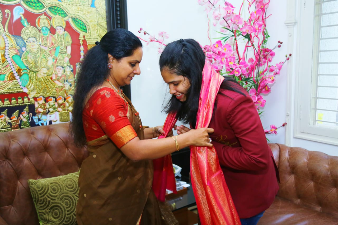 సిక్కిరెడ్డి అంతర్జాతీయ క్రీడా వేదికల్లో బ్యాడ్మింటన్ డబుల్స్ క్రీడాకారిణిగా తెలంగాణ కీర్తిపతాకాన్ని ఎగురవేశారని కవిత ప్రశంసించారు. మోకాలి గాయంతో ఒక దశలో రాకెట్ పట్ట లేని పరిస్థితిని ఆత్మవిశ్వాసంతో అధిగమించి, ప్రాక్టీస్ ను కొనసాగించిన సిక్కి రెడ్డి క్రీడాకారులందరికీ స్ఫూర్తి గా నిలిచారని ఎంపీ కవిత అన్నారు. ఈ సందర్భంగా సిక్కిరెడ్డికి బతుకమ్మ జ్ఞాపికను ఎంపి కవిత అందజేశారు.