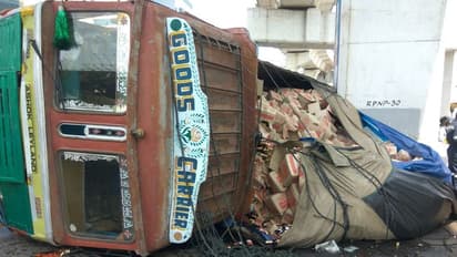 హైదరాబాద్: హైదరాబాద్ బేగంపేట ఫ్లైఓవర్ సమీపంలో బీర్ల లోడుతో వెళ్తున్న లారీ బోల్తాపడింది. బీర్ బాటిల్స్ కొన్ని ధ్వంసమయ్యాయి. కొన్నిబాటిల్స్ మాత్రం అట్టపెట్టెల్లోనే పగిలిపోకుండా ఉన్నాయి.