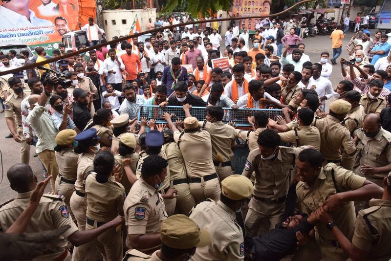 పోలీసులు ఆబ్కారీ భవనంలోకి నిరసనకారులను వెళ్లకుండా అడ్డుకున్నారు. బీజేవైఎం నాయకులు, కార్యకర్తలను పోలీసులు అడ్డుకోవడంతో ఉద్రిక్తత చోటుచేసుకుంది. పోలీసులు, బిజేవైఎం నాయకులకు మధ్య కొద్దిసేపు వాగ్వివాదం, ఆ తర్వాత తోపులాటలు చోటు చేసుకుంది.
